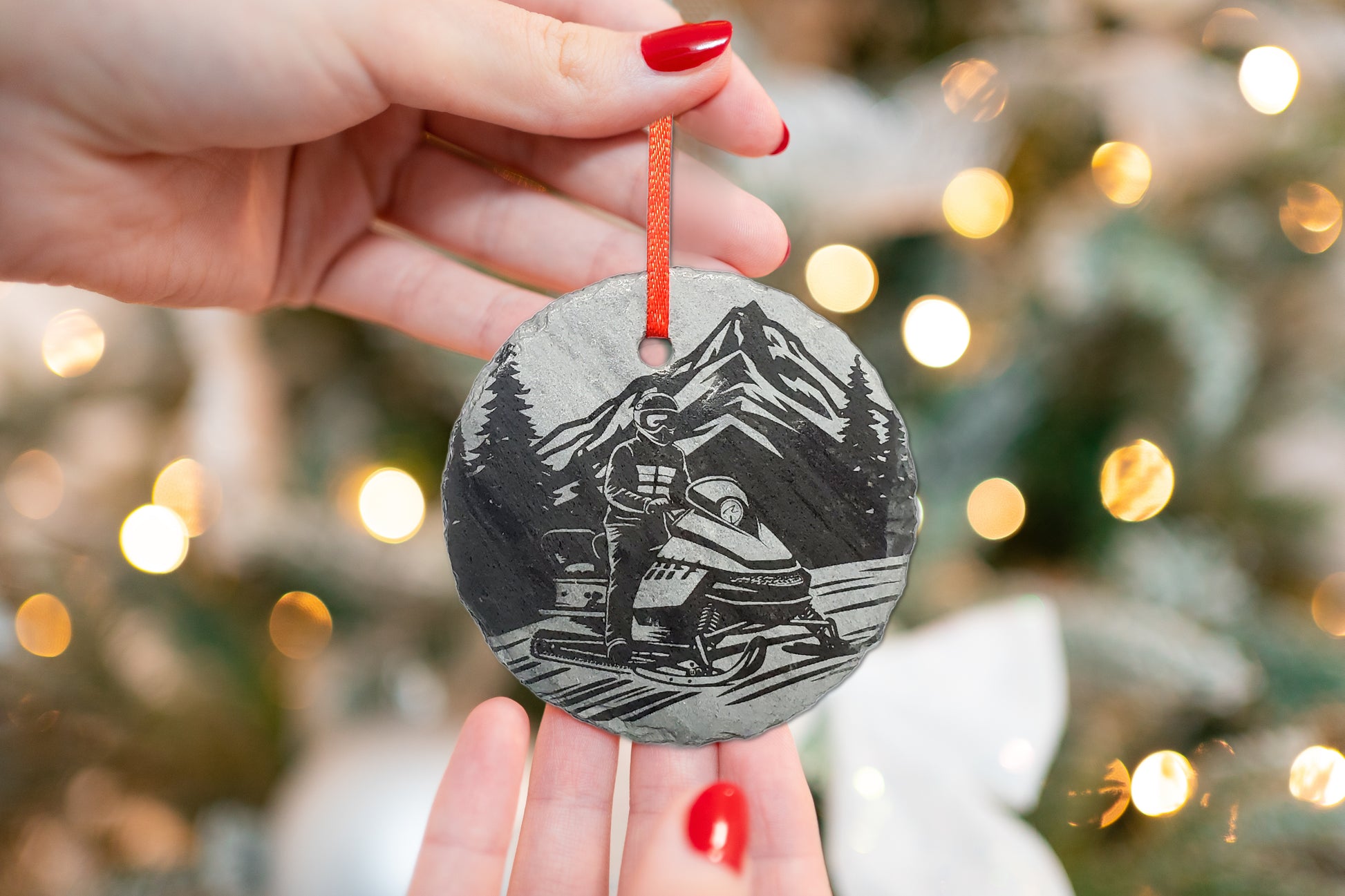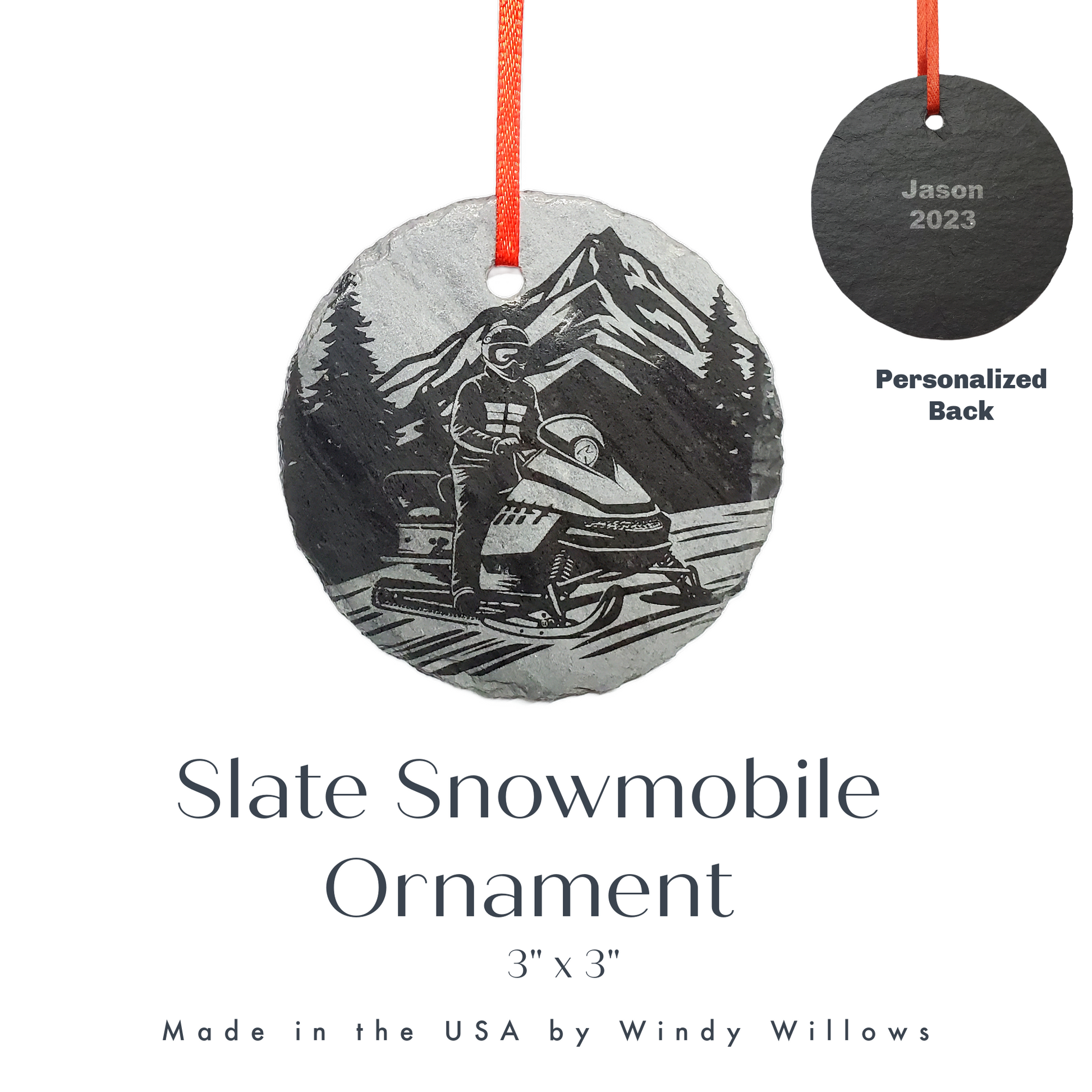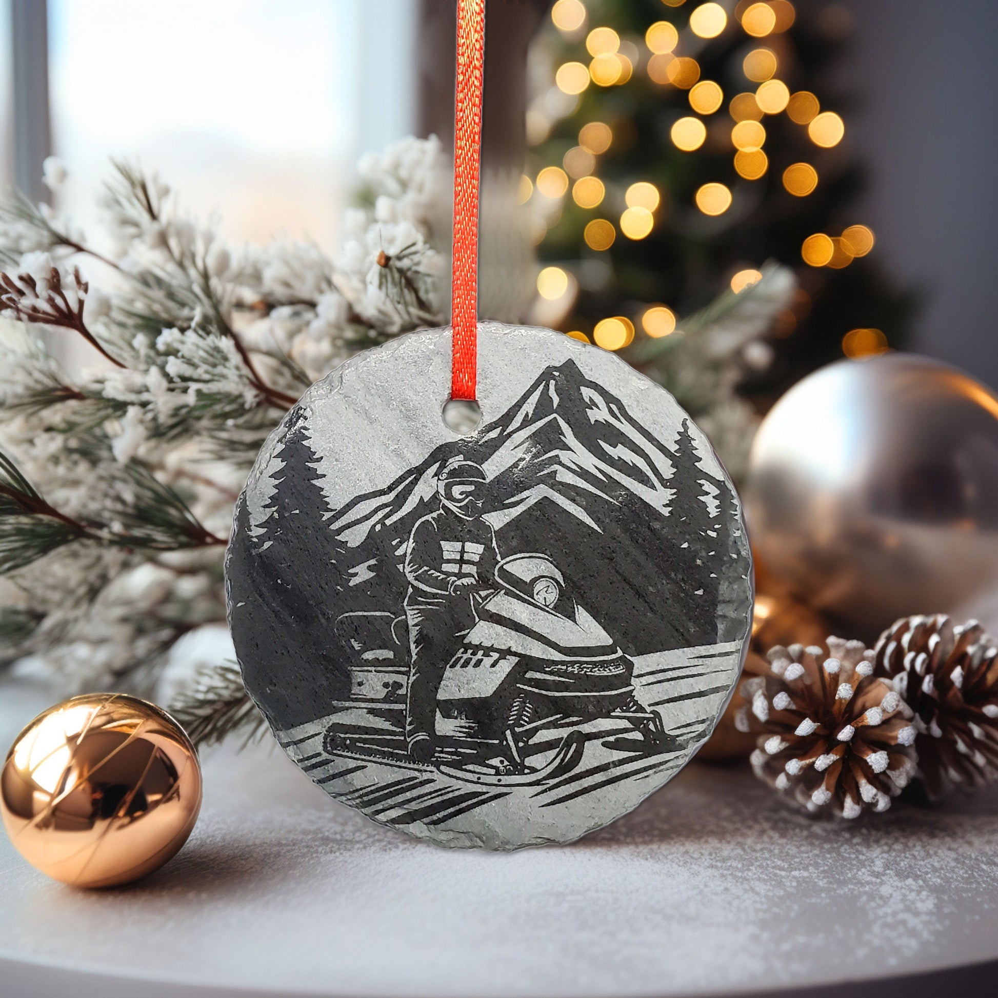Snowmobile Christmas Ornament, a delightful 3" round keepsake crafted in the USA from natural slate. This unique ornament captures the spirit of adventure, featuring an intricately engraved scene of a Snowmobiler in the heart of nature. A perfect gift for a snowmobiling enthusiast.